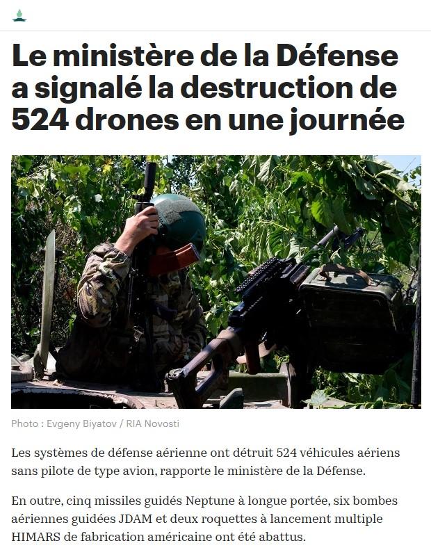 Les systèmes de défense aérienne ont détruit 524 véhicules aériens sans pilote de type avion, rapporte le ministère de la Défense.