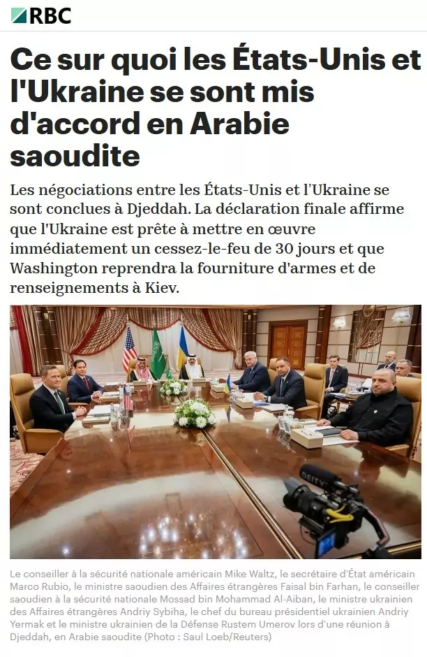 Les négociations entre les États-Unis et l’Ukraine se sont conclues à Djeddah. La déclaration finale affirme que l’Ukraine est prête à mettre en œuvre immédiatement un cessez-le-feu de 30 jours et que Washington reprendra la fourniture d’armes et de renseignements à Kiev.
