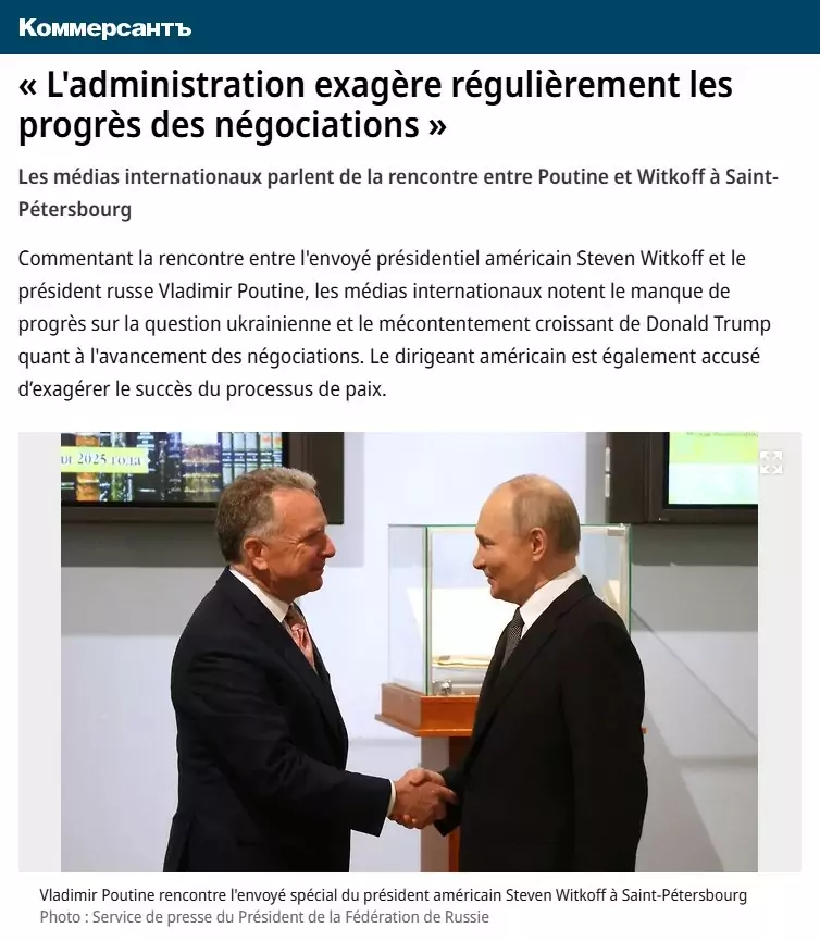 Commentant la rencontre entre l’envoyé présidentiel américain Steven Witkoff et le président russe Vladimir Poutine, les médias internationaux notent le manque de progrès sur la question ukrainienne et le mécontentement croissant de Donald Trump quant à l’avancement des négociations. Le dirigeant américain est également accusé d’exagérer le succès du processus de paix.