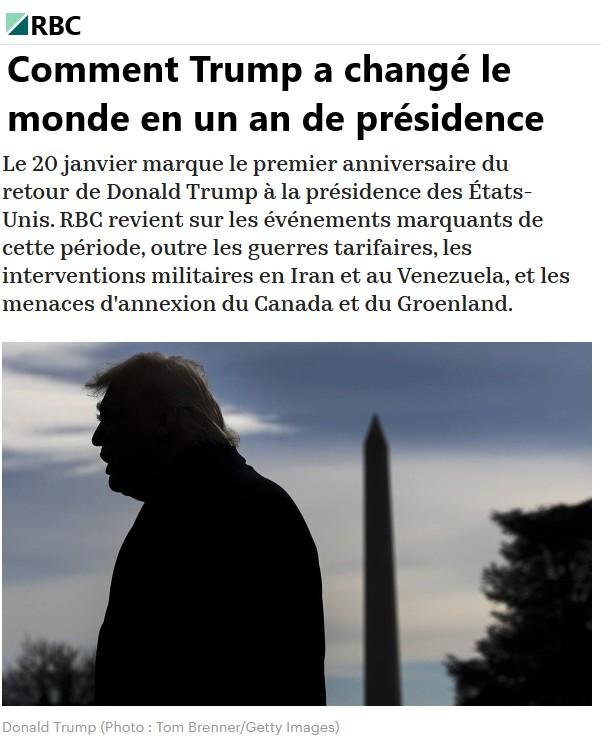 Le 20 janvier marque le premier anniversaire du retour de Donald Trump à la présidence des États-Unis. RBC revient sur les événements marquants de cette période, outre les guerres tarifaires, les interventions militaires en Iran et au Venezuela, et les menaces d’annexion du Canada et du Groenland.