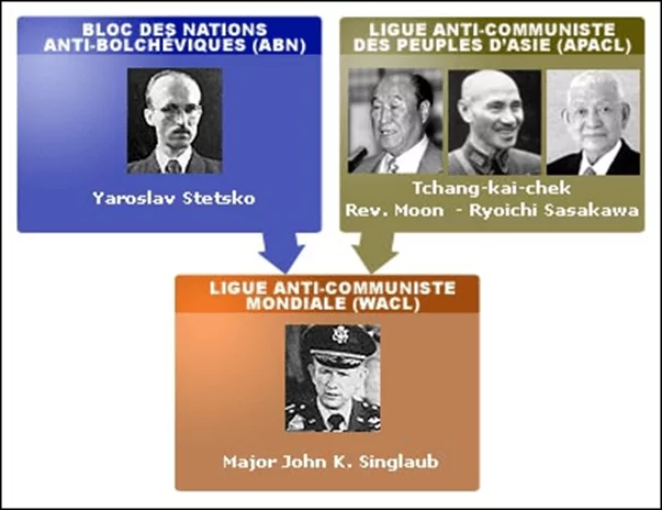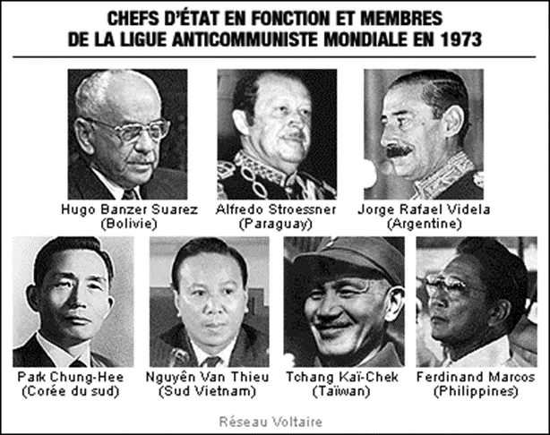 Fondée à Taiwan par Tchang Kaï-Chek, le révérend Moon et des criminels de guerre nazis et nippons, la Ligue anti-communiste mondiale (WACL) a d’abord été utilisée sous Nixon pour étendre les méthodes de contre-insurrection en Asie du Sud-Est et en Amérique latine.