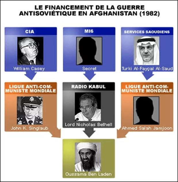 [17] Oussama Ben Laden n’est pas présenté à l’époque comme un musulman pieux, mais comme un homme d’affaires anti-communiste choisi par le prince Turki, directeur des services secrets saoudiens, pour participer aux côté des États-Unis à la guerre contre les Soviétiques. Ben Laden s’occupe d’abord de diriger la construction des infrastructures nécessaires aux « combattants de la liberté », puis il gère l’intendance des moudjahidins étrangers qui les rejoignent. Il ne se transformera en musulman pieux que tardivement pour prendre autorité sur ces derniers.