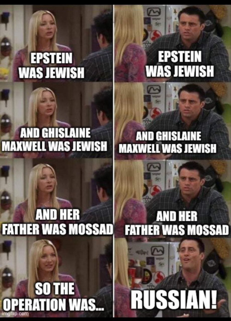 Les Russes sont partout : ils sont derrière de faux comptes acharnés sur les réseaux à salir l’image de notre valeureuse élite française, et évidemment ils tirent les ficelles du réseau Epstein. On ne voit pas le nom de V. Poutine parmi les noms des amateurs de chair juvénile ? Au lieu d’en conclure (bon sens et logique) que la classe politique russe ne compte pas de B. Gates, de G. Bush ou de B. Clinton, et que peut-être (!) les propos de V. Poutine sur la décadence et la perversion de l’Occident sont justes, les médias français affirment que s’ils ne sont pas sur la scène c’est parce qu’en coulisses ils tirent les ficelles ! Encore plus fort, Le Monde écrit le 10 février : le « souhait [d’Epstein], réitéré maintes fois, de rencontrer Vladimir Poutine n’a pas été exaucé, semble-t-il, pas plus que son désir de se rendre en Russie, malgré moult demandes de visa ». On nous explique donc que Poutine a refusé de voir Epstein et même de le faire entrer en Russie, mais pourtant les Russes seraient à la manœuvre…