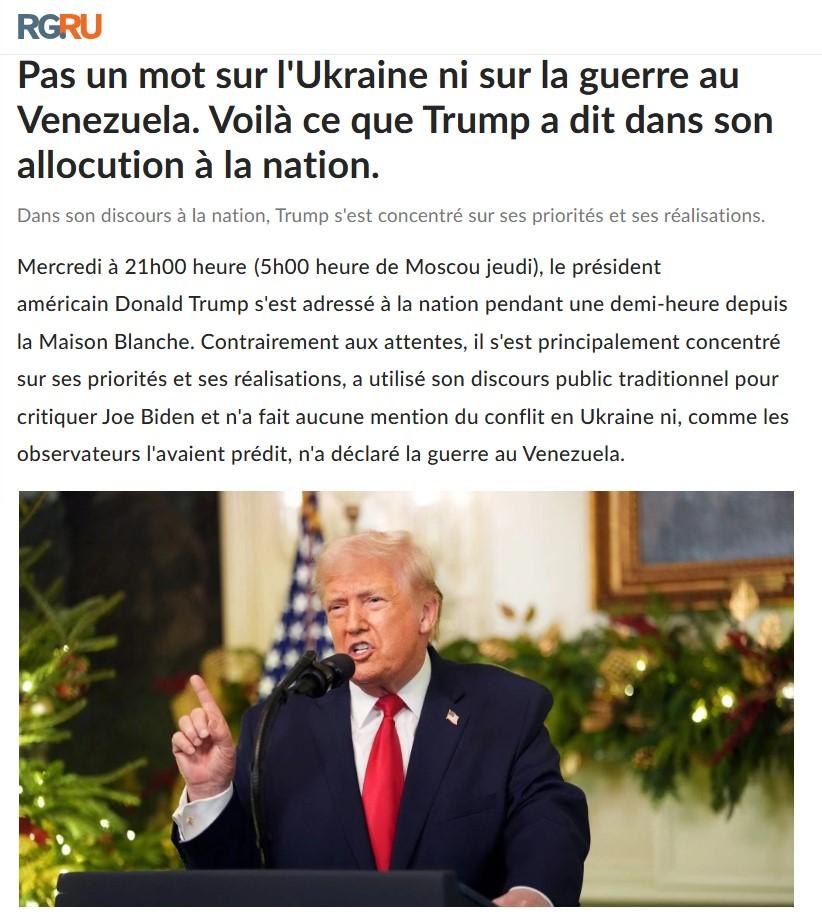 Mercredi à 21h00 heure de l’Est (5h00 heure de Moscou jeudi), le président américain Donald Trump s’est adressé à la nation pendant une demi-heure depuis la Maison Blanche. Contrairement aux attentes, il s’est principalement concentré sur ses priorités et ses réalisations, a utilisé son discours public traditionnel pour critiquer Joe Biden et n’a fait aucune mention du conflit en Ukraine ni, comme les observateurs l’avaient prédit, n’a déclaré la guerre au Venezuela.