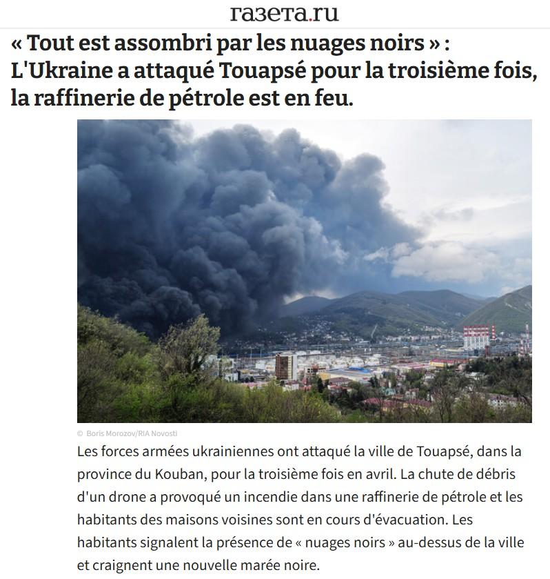 Les forces armées ukrainiennes ont attaqué la ville de Touapsé, dans la province du Kouban, pour la troisième fois en avril. La chute de débris d’un drone a provoqué un incendie dans une raffinerie de pétrole et les habitants des maisons voisines sont en cours d’évacuation. Les habitants signalent la présence de « nuages noirs » au-dessus de la ville et craignent une nouvelle marée noire.