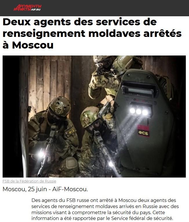 Des agents du FSB russe ont arrêté à Moscou deux agents des services de renseignement moldaves arrivés en Russie avec des missions visant à compromettre la sécurité du pays. Cette information a été rapportée par le Service fédéral de sécurité.