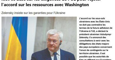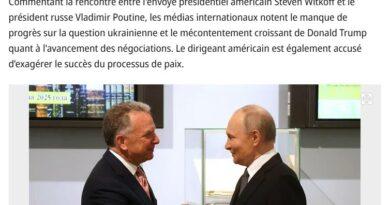 Sécurité La bataille du Donbass entre dans sa phase finale avec la libération de Seversk Les États-Unis se sont emparés d’un pétrolier au large du Venezuela Le Premier ministre qatari révèle une coordination avec les États-Unis et Israël pour lutter contre le Hamas ! La Lituanie décrète l’état d’urgence à cause de ballons météo provenant de Biélorussie États-Unis. Le chef du Pentagone, Pete Hegseth, dans la tempête ! Les affrontements reprennent entre le Cambodge et la Thaïlande malgré la paix de Trump en octobre Poutine : le Donbass et la Novorossiya passeront quoi qu’il arrive sous contrôle russe « Nous avons discuté du fond, pas des termes précis » : les négociations entre Poutine, Witkoff et Kushner ont duré près de cinq heures Kiev s’en prend à des pétroliers et des cargos en mer Noire pour saborder les efforts de paix Le SVR avertit que si la France déploie des sociétés militaires privées en Ukraine, elles deviendront des cibles légitimes Poutine en visite dans un centre de commandement sur le front et a été informé de la prise de Krasnoarmeïsk (Pokrovsk) et Voltchansk Le FSB a déjoué un attentat ukrainien visant un haut gradé russe et sa famille Zelensky prépare un nouveau plan de Défense comprenant une ligne de drones et des bataillons de femmes Des délégations américaine et ukrainienne se sont rencontrées à Miami Poutine déclare qu’il est impossible de négocier avec l’Ukraine, seul le plan américain est pertinent Les États-Unis suspendent l’immigration en provenance d’Afghanistan suite à une fusillade près de la Maison-Blanche La fuite de conversations entre Witkoff et Ouchakov vise à saboter les négociations L’armée prend le pouvoir en Guinée-Bissau peu après les élections générales Les délégations américaine, russe et ukrainienne se sont rencontrées à Abou Dhabi pour discuter du plan de paix L’OTAN entame les exercices Freezing Winds dans les eaux estoniennes et finlandaises Selon la Maison-Blanche, la plupart des points du nouveau plan de paix de Trump ont fait l’objet d’un accord L’armée ukrainienne pourrait refuser le plan de Trump et accuser Kiev de trahison Les États-Unis, l’Union européenne et Kiev ont discuté du plan de paix de Trump à Genève Nebenzia donne le chiffre de 1,7 million de pertes ukrainiennes depuis le début de l’opération militaire spéciale L’armée russe s’empare de Koupyansk, les troupes ukrainiennes à l’est de l’Oskol sont isolées Trump propose un nouveau plan de paix pour l’Ukraine Poutine s’entretient avec Gerassimov à l’un des postes de commandement du groupe Zapad dans le Donbass Washington propose un nouveau plan de règlement du conflit ukrainien La France promet 100 Rafale à Zelensky mais personne n’a l’argent pour les commander Le Moskovsky Komsomolets affirme que le haut responsable russe visé dans un cimetière était Choïgou Le chemin de fer reliant Varsovie à l’Ukraine endommagé, Tusk soupçonne un sabotage Hegseth annonce l’opération “Lance du Sud” dirigée contre les cartels Le FSB déjoue un attentat ukrainien visant un haut responsable russe Moscou déclare qu’il n’attendait rien des négociations après leur suspension par Kiev Le FSB déjoue une tentative de Kiev de détourner un MiG-31 armé d’un Kinjal États-Unis: Quand le FBI enquête sur des “groupes criminels” Israëliens mais évite d’en parler publiquement ! Pourquoi le sort du Venezuela importe à l’Iran ! Trump affirme que des progrès significatifs ont été accomplis sur le règlement du conflit en Ukraine Les responsables sécuritaires de la CEI se réunissent à Moscou pour aborder la menace que fait peser l’OTAN Biélooussov propose à Poutine de lancer des préparatifs d’essais nucléaires La Russie n’envoie plus de cartes du front en Ukraine aux États-Unis Les États-Unis procèderont bientôt à un tir de missile Minuteman Kiev cherche 150 milliards de dollars pour 250 avions de chasse européens, mais les négociations sont au point mort Un raid de commissaires militaires sur un marché d’Odessa dégénère en bagarre Trump ordonne au Pentagone de lancer des essais d’armes nucléaires Trump et Xi ont discuté en Corée du Sud de l’Ukraine et des droits de douane Poutine annonce vouloir un cessez-le-feu temporaire pour que les journalistes observent l’encerclement des troupes ukrainiennes et revient sur les essais réussis du drone-torpille Poséidon et du missile Sarmat Que savons-nous du Burevestnik, le missile nucléaire russe encensé par Vladimir Poutine ? Israël lance de nouvelles frappes contre Gaza Soudan : tournant dans la guerre civile avec la chute d’une ville clef de l’ouest du pays Lavrov à Minsk pour la conférence sur la sécurité eurasiatique La France prépare un contingent de 2 000 militaires à envoyer en Ukraine, selon le renseignement extérieur russe La Russie teste le missile à portée presque illimitée Burevestnik (Oiseau-tempête) Les troupes russes contrôlent la majeure partie de Krasnoarmeïsk (Pokrovsk) Jacques HOGARD sans concessions Poutine dirige des exercices de la triade nucléaire Moscou annonce que Kiev a donné des garanties de sécurité pour rétablir l’alimentation de la centrale de Zaporojié Le cambriolage du Louvre est un signe du déclin de la France, selon Pavel Dourov Entrée des russes à Pokrovsk: Le Donbass sur le point de tomber et Zelenskyy veut maintenant négocier à Budapest ! Moscou et Washington sont directement en contact sur la question des Tomahawk Zelensky maltraité par Trump lors de leur rencontre à la Maison-Blanche Après un entretien téléphonique, Poutine et Trump s’accordent sur une rencontre à Budapest Le régime des Mollahs va-t-il s’effondrer ? La communauté du renseignement allemand désigne la Russie comme la principale menace et appelle à des “préparatifs” Kiev espère obtenir des Tomahawk aux frais d