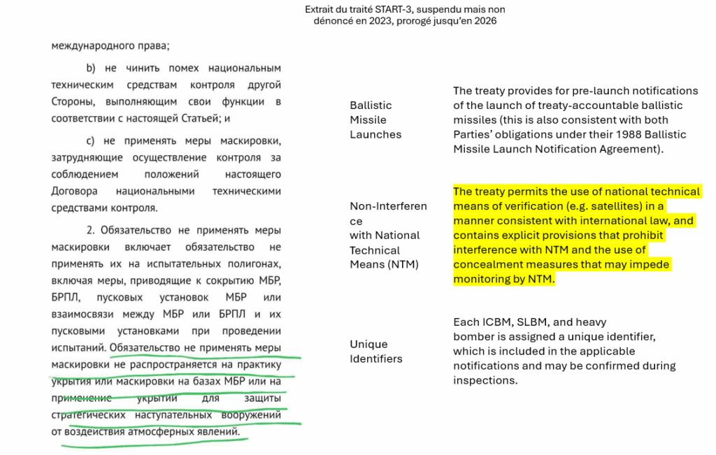6. Le traité START-3 ou New START signé en 2011 et prolongé jusqu’en 2026, contraint les parties à accepter des mesures de contrôles des équipements nucléaires et en particulier à ne pas les dissimuler face aux mesures techniques de l’autre partie. La Russie a suspendu sa participation en avril 2023 et il n’y a plus eu d’inspections sur site depuis 2022. Toutefois le texte prévoit expressément une clause « Non‑Interference with National Technical Means (NTM) ». « The treaty permits the use of national technical means of verification (e.g. satellites) in a manner consistent with international law, and contains explicit provisions that prohibit interference with NTM and the use of concealment measures that may impede monitoring by NTM. »