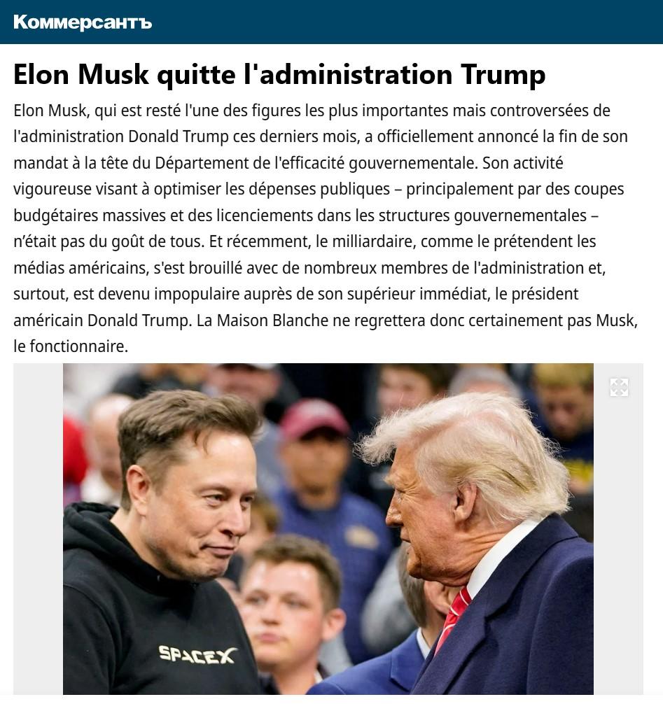 Elon Musk, qui est resté l’une des figures les plus importantes mais controversées de l’administration Donald Trump ces derniers mois, a officiellement annoncé la fin de son mandat à la tête du Département de l’efficacité gouvernementale. Son activité vigoureuse visant à optimiser les dépenses publiques – principalement par des coupes budgétaires massives et des licenciements dans les structures gouvernementales – n’était pas du goût de tous. Et récemment, le milliardaire, comme le prétendent les médias américains, s’est brouillé avec de nombreux membres de l’administration et, surtout, est devenu impopulaire auprès de son supérieur immédiat, le président américain Donald Trump. La Maison Blanche ne regrettera donc certainement pas Musk, le fonctionnaire.