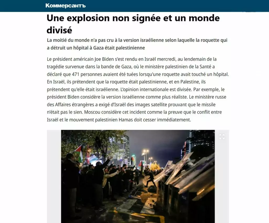 Le président américain Joe Biden s’est rendu en Israël mercredi, au lendemain de la tragédie survenue dans la bande de Gaza, où le ministère palestinien de la Santé a déclaré que 471 personnes avaient été tuées lorsqu’une roquette avait touché un hôpital. En Israël, ils prétendent que la roquette était palestinienne, et en Palestine, ils prétendent qu’elle était israélienne. L’opinion internationale est divisée. Par exemple, le président Biden considère la version israélienne comme plus réaliste. Le ministère russe des Affaires étrangères a exigé d’Israël des images satellite prouvant que le missile n’était pas le sien. Moscou considère cet incident comme la preuve que le conflit entre Israël et le mouvement palestinien Hamas doit cesser immédiatement.