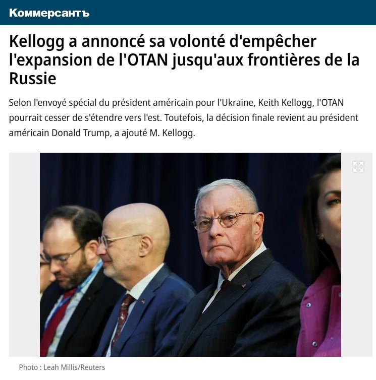 Selon l’envoyé spécial du président américain pour l’Ukraine, Keith Kellogg, l’OTAN pourrait cesser de s’étendre vers l’est. Toutefois, la décision finale revient au président américain Donald Trump, a ajouté M. Kellogg.