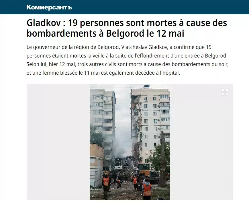 Le gouverneur de la région de Belgorod, Viatcheslav Gladkov, a confirmé que 15 personnes étaient mortes la veille à la suite de l’effondrement d’une entrée à Belgorod. Selon lui, hier 12 mai, trois autres civils sont morts à cause des bombardements du soir, et une femme blessée le 11 mai est également décédée à l’hôpital.