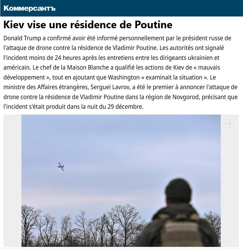 Donald Trump a confirmé avoir été informé personnellement par le président russe de l’attaque de drone contre la résidence de Vladimir Poutine. Les autorités ont signalé l’incident moins de 24 heures après les entretiens entre les dirigeants ukrainien et américain. Le chef de la Maison Blanche a qualifié les actions de Kiev de « mauvais développement », tout en ajoutant que Washington « examinait la situation ». Le ministre des Affaires étrangères, Sergueï Lavrov, a été le premier à annoncer l’attaque de drone contre la résidence de Vladimir Poutine dans la région de Novgorod, précisant que l’incident s’était produit dans la nuit du 29 décembre.