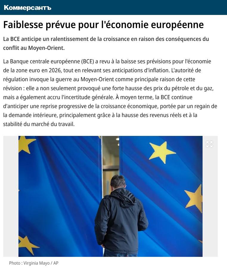 La Banque centrale européenne (BCE) a revu à la baisse ses prévisions pour l’économie de la zone euro en 2026, tout en relevant ses anticipations d’inflation. L’autorité de régulation invoque la guerre au Moyen-Orient comme principale raison de cette révision : elle a non seulement provoqué une forte hausse des prix du pétrole et du gaz, mais a également accru l’incertitude générale. À moyen terme, la BCE continue d’anticiper une reprise progressive de la croissance économique, portée par un regain de la demande intérieure, principalement grâce à la hausse des revenus réels et à la stabilité du marché du travail.