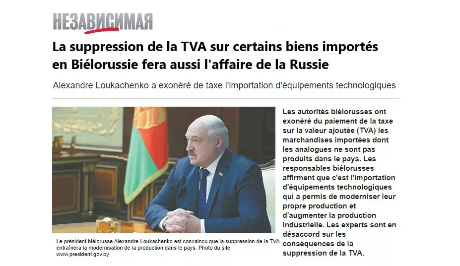 Les autorités biélorusses ont exonéré du paiement de la taxe sur la valeur ajoutée (TVA) les marchandises importées dont les analogues ne sont pas produits dans le pays. Les responsables biélorusses affirment que c’est l’importation d’équipements technologiques qui a permis de moderniser leur propre production et d’augmenter la production industrielle. Les experts sont en désaccord sur les conséquences de la suppression de la TVA.