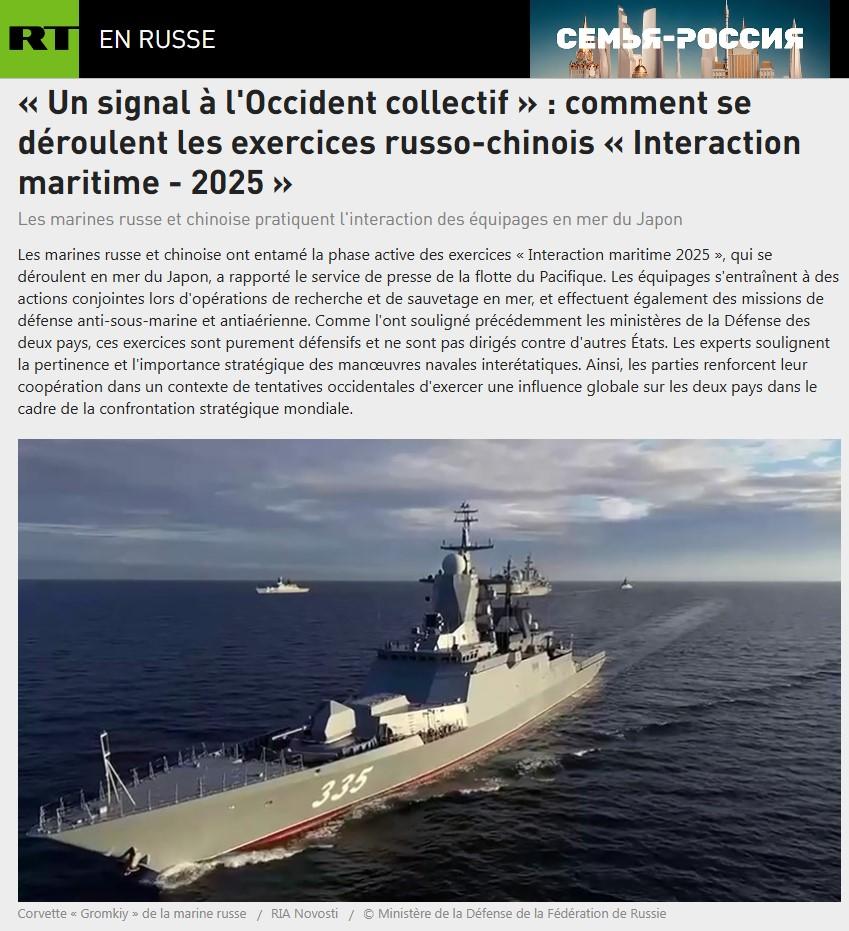 Les marines russe et chinoise ont entamé la phase active des exercices « Interaction maritime 2025 », qui se déroulent en mer du Japon, a rapporté le service de presse de la flotte du Pacifique. Les équipages s’entraînent à des actions conjointes lors d’opérations de recherche et de sauvetage en mer, et effectuent également des missions de défense anti-sous-marine et antiaérienne. Comme l’ont souligné précédemment les ministères de la Défense des deux pays, ces exercices sont purement défensifs et ne sont pas dirigés contre d’autres États. Les experts soulignent la pertinence et l’importance stratégique des manœuvres navales interétatiques. Ainsi, les parties renforcent leur coopération dans un contexte de tentatives occidentales d’exercer une influence globale sur les deux pays dans le cadre de la confrontation stratégique mondiale.