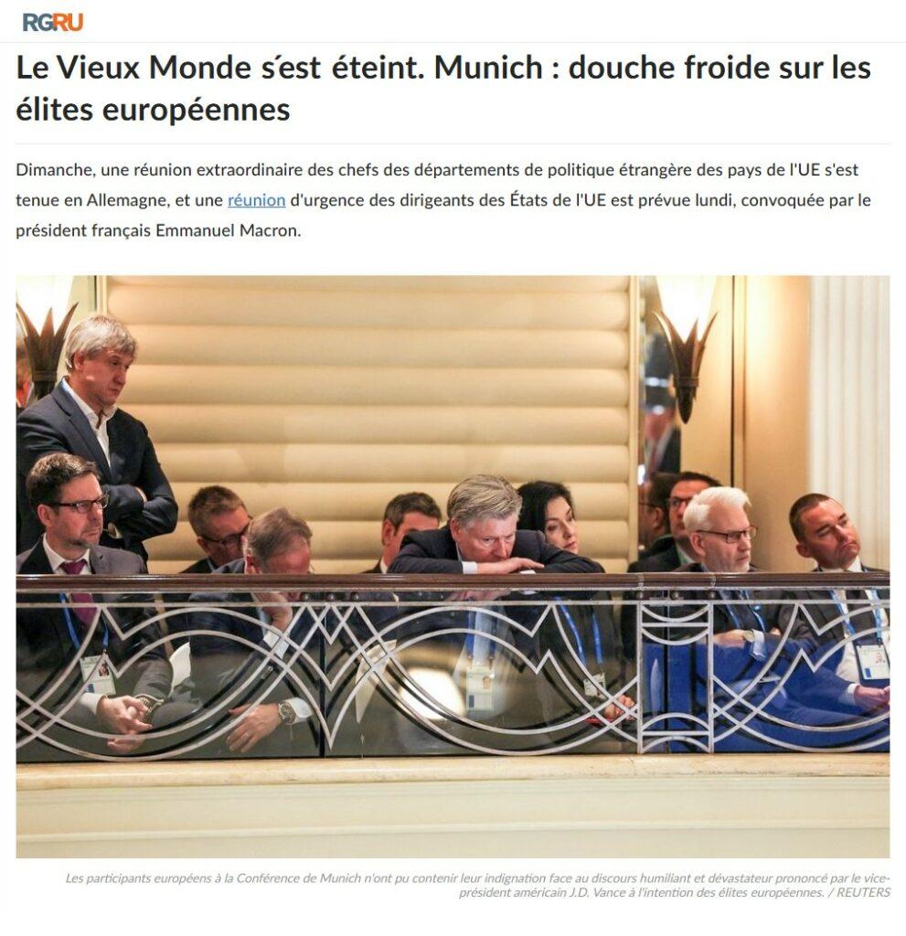 Selon le ministre polonais des Affaires étrangères Radoslaw Sikorski, il s’attend à ce que lors du sommet, les dirigeants européens « discutent très sérieusement des défis posés par le président américain Donald Trump ». Les médias internationaux ont donné une large gamme d’évaluations de ce qui s’est passé à Munich ce week-end, allant de l’effondrement de l’Europe et du tremblement de terre politique à la réprimande reçue par la Maison-Blanche lors de la conférence pour avoir empiété sur les valeurs européennes. Le journal Washington Post rappelle à ce propos l’année 2007, lorsque le président russe Vladimir Poutine, lors de la conférence de Munich, « a choqué l’opinion publique en exigeant l’abandon de l’influence dominante de l’Amérique et l’établissement d’un nouvel équilibre des pouvoirs en Europe ».