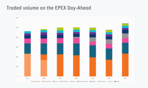 Volumes électriques négociés (TWh) Spot market en Day Ahead (J-1) (source Epex Spot)
