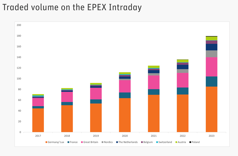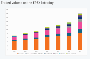 Volumes électriques négociés (TWh) Spot market en Intra Day (Source Epex Spot)