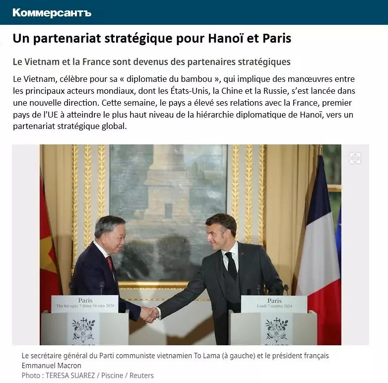 Le Vietnam, célèbre pour sa « diplomatie du bambou », qui implique des manœuvres entre les principaux acteurs mondiaux, dont les États-Unis, la Chine et la Russie, s’est lancée dans une nouvelle direction. Cette semaine, le pays a élevé ses relations avec la France, premier pays de l’UE à atteindre le plus haut niveau de la hiérarchie diplomatique de Hanoï, vers un partenariat stratégique global.