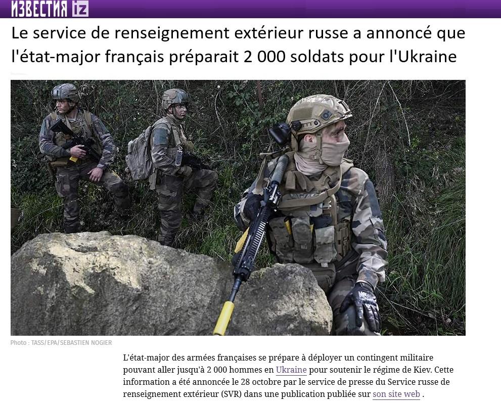 L’état-major des armées français se prépare à déployer un contingent militaire pouvant aller jusqu’à 2 000 hommes en Ukraine pour soutenir le régime de Kiev. Cette information a été annoncée le 28 octobre par le service de presse du Service russe de renseignement extérieur (SVR) dans une publication publiée sur son site web.