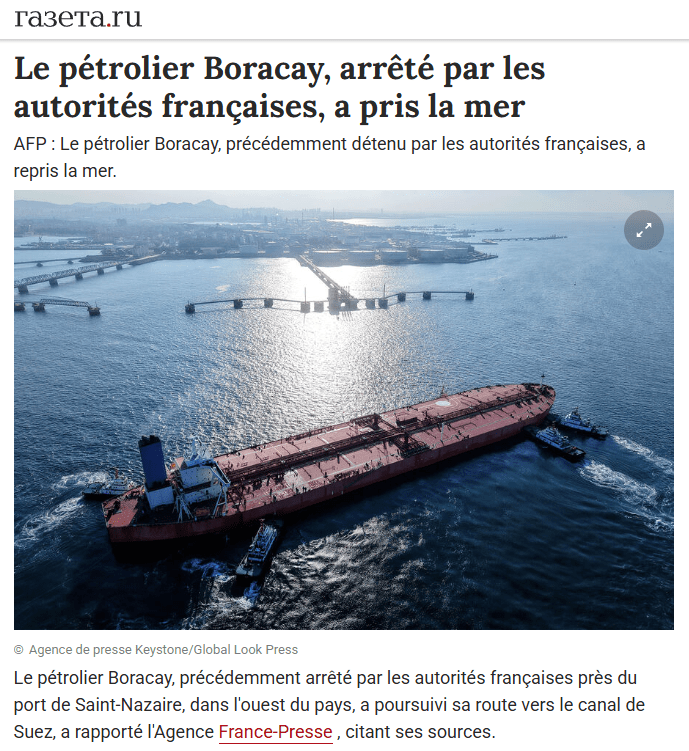 L’arraisonnement de ce pétrolier par les autorités françaises n’est-il pas simplement une gesticulation puérile d’un dirigeant qui ignore ses propres règles? Les navires de la flotte fantôme (terme déjà vague et sans valeur juridique en lui-même) sont à ma connaissance soumis uniquement à des restrictions leur interdisant l’accès aux ports de l’UE et la fourniture de services. Tout au plus peut-on y rajouter des sanctions pour transport de pétrole russe vendu à des prix au dessus du plafond fixé à quiconque, même hors UE, sans que l’on sache très bien comment cela pourrait être contrôlé (sans parler de la violation flagrante du droit international du commerce par de telles sanctions). Que peut-on donc reprocher à un pétrolier qui transporte du pétrole russe vers une destination hors UE? Rien si on ne peut pas prouver que ce pétrole est payé plus que le plafond imposé par une loi inique et unilatérale (et même dans ce cas toute sanction serait illégale aux yeux du droit international). C’est bien pour cela que macron a du laisser aussitôt repartir le Boracay, tout en continuant de le menacer de loin du doigt, comme un gamin impertinent, capricieux inconséquent et immature. Après coup, face à la prise de conscience du ridicule de sa décision, il a inventé le prétexte de suspicion de “transport d’armes”, mais dans ce cas il fallait juste parler de navire contrebandier et non de navire fantôme, terme réservé par les anti russes aux transporteurs de pétrole russe.
