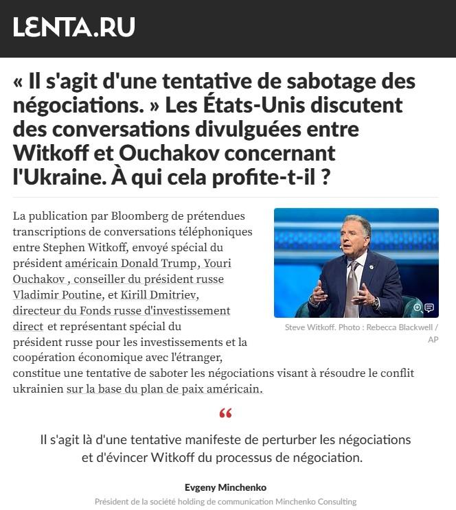 La fuite de conversations entre Witkoff et Ouchakov vise à saboter les négociations