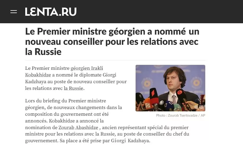 Lors du briefing du Premier ministre géorgien, de nouveaux changements dans la composition du gouvernement ont été annoncés. Kobakhidze a annoncé la nomination de Zourab Abashidze, ancien représentant spécial du Premier ministre pour les relations avec la Russie, au poste de conseiller du chef du gouvernement. Sa place a été prise par Giorgi Kadzhaya.