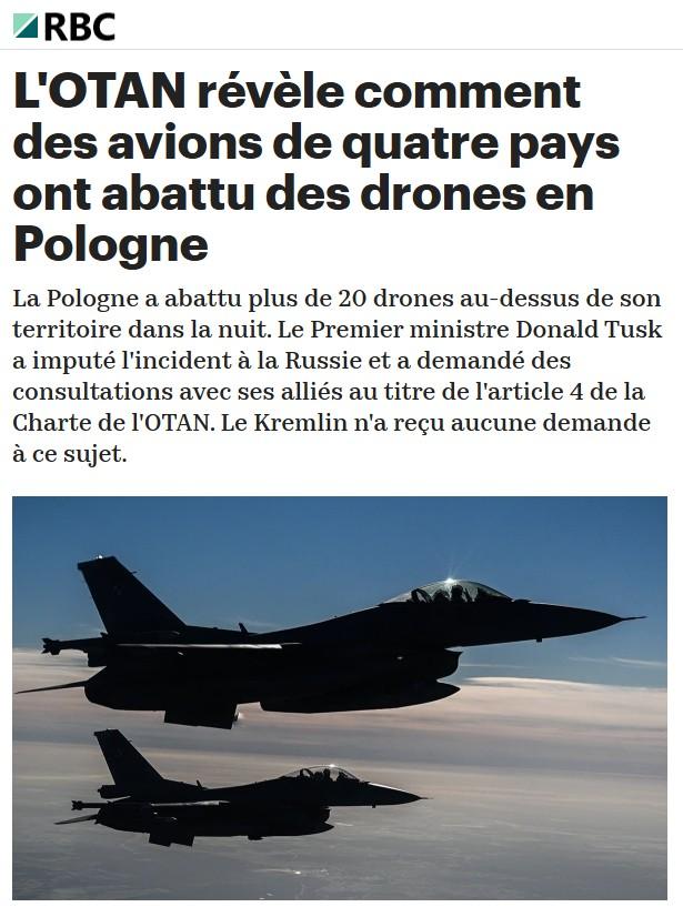 La Pologne a abattu plus de 20 drones au-dessus de son territoire dans la nuit. Le Premier ministre Donald Tusk a imputé l’incident à la Russie et a demandé des consultations avec ses alliés au titre de l’article 4 de la Charte de l’OTAN. Le Kremlin n’a reçu aucune demande à ce sujet.