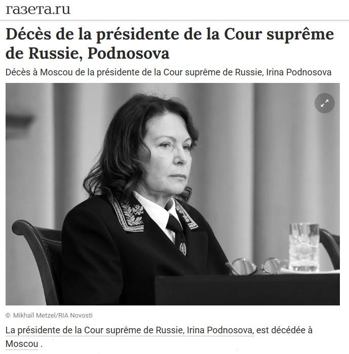 La présidente de la Cour suprême de Russie, Irina Podnosova, est décédée à Moscou. L’information a été rapportée par l’agence TASS, citant le service de presse de la Cour suprême.