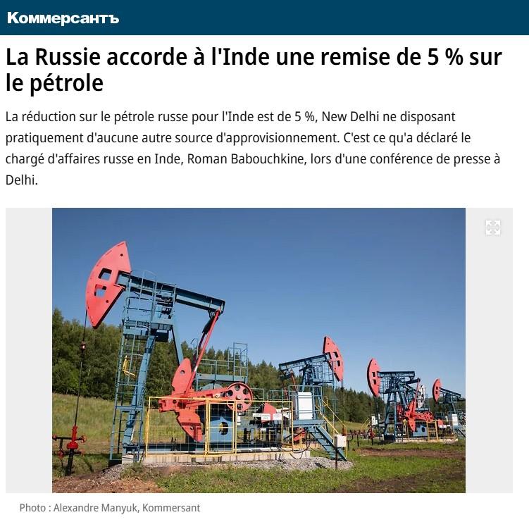 La réduction sur le pétrole russe pour l’Inde est de 5 %, New Delhi ne disposant pratiquement d’aucune autre source d’approvisionnement. C’est ce qu’a déclaré le chargé d’affaires russe en Inde, Roman Babouchkine, lors d’une conférence de presse à Delhi.
