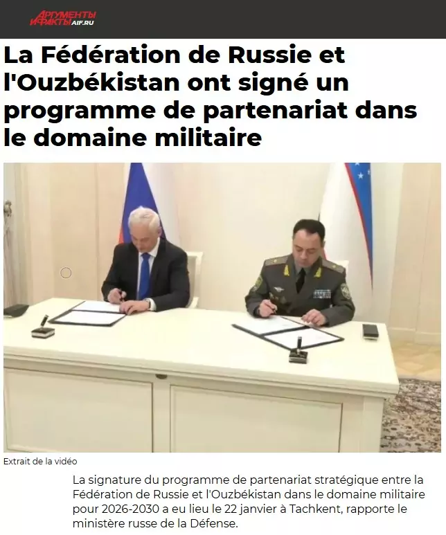 La signature du programme de partenariat stratégique entre la Fédération de Russie et l’Ouzbékistan dans le domaine militaire pour 2026-2030 a eu lieu le 22 janvier à Tachkent, rapporte le ministère russe de la Défense.