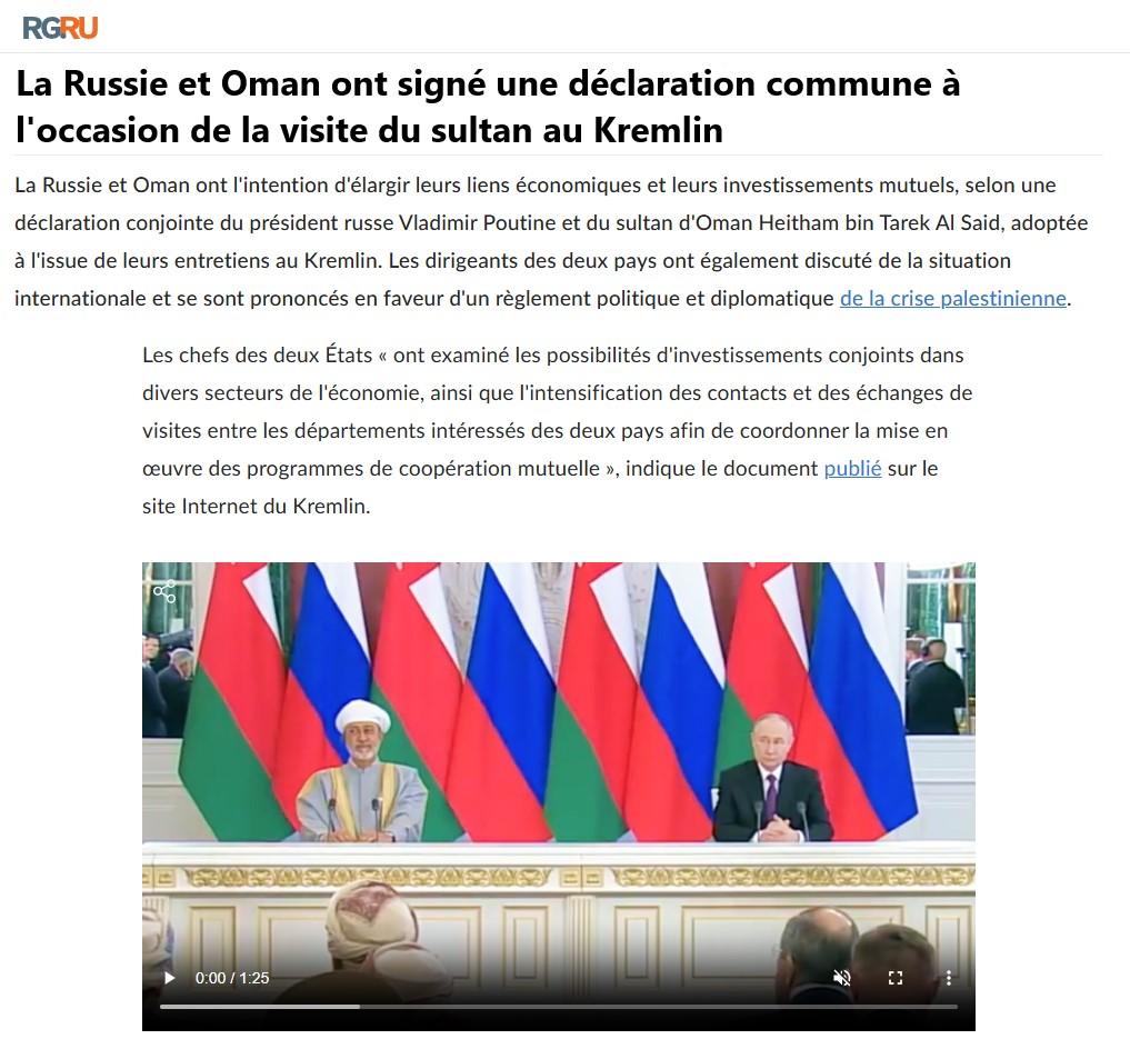 La Russie et Oman ont l’intention d’élargir leurs liens économiques et leurs investissements mutuels, selon une déclaration conjointe du président russe Vladimir Poutine et du sultan d’Oman Heitham bin Tarek Al Said, adoptée à l’issue de leurs entretiens au Kremlin. Les dirigeants des deux pays ont également discuté de la situation internationale et se sont prononcés en faveur d’un règlement politique et diplomatique de la crise palestinienne.