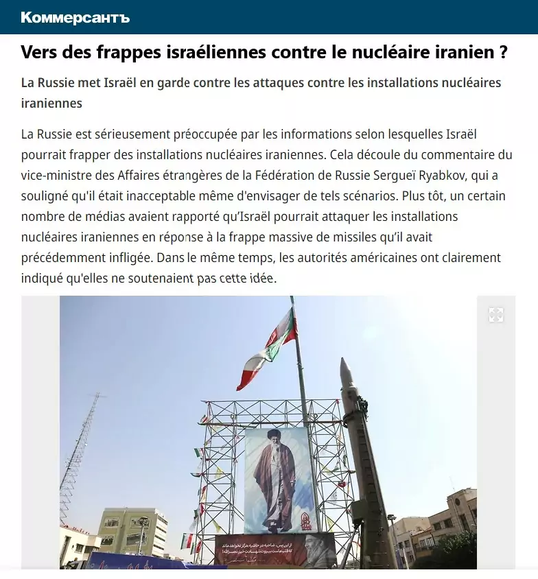 La Russie est sérieusement préoccupée par les informations selon lesquelles Israël pourrait frapper des installations nucléaires iraniennes. Cela découle du commentaire du vice-ministre des Affaires étrangères de la Fédération de Russie Sergueï Ryabkov, qui a souligné qu’il était inacceptable même d’envisager de tels scénarios. Plus tôt, un certain nombre de médias avaient rapporté qu’Israël pourrait attaquer les installations nucléaires iraniennes en réponse à la frappe massive de missiles qu’il avait précédemment infligée. Dans le même temps, les autorités américaines ont clairement indiqué qu’elles ne soutenaient pas cette idée.