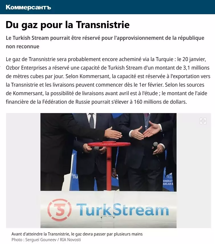 Le gaz de Transnistrie sera probablement encore acheminé via la Turquie : le 20 janvier, Ozbor Enterprises a réservé une capacité de Turkish Stream d’un montant de 3,1 millions de mètres cubes par jour. Selon Kommersant, la capacité est réservée à l’exportation vers la Transnistrie et les livraisons peuvent commencer dès le 1er février. Selon les sources de Kommersant, la possibilité de livraisons avant avril est à l’étude ; le montant de l’aide financière de la Fédération de Russie pourrait s’élever à 160 millions de dollars.