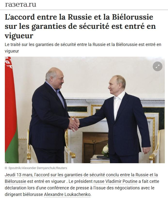 Jeudi 13 mars, l’accord sur les garanties de sécurité conclu entre la Russie et la Biélorussie est entré en vigueur. Le président russe Vladimir Poutine a fait cette déclaration lors d’une conférence de presse à l’issue des négociations avec le dirigeant biélorusse Alexandre Loukachenko.