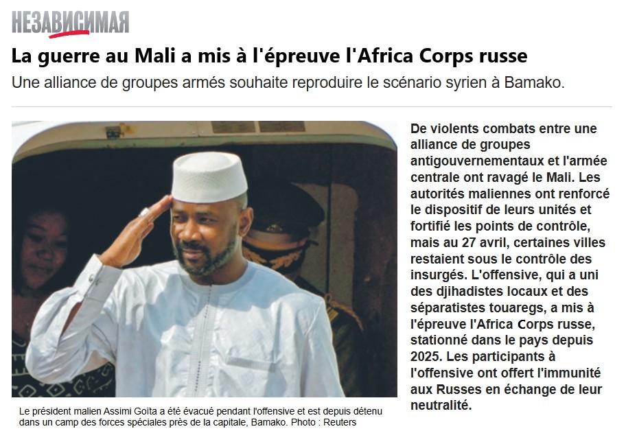 De violents combats entre une alliance de groupes antigouvernementaux et l’armée centrale ont ravagé le Mali. Les autorités maliennes ont renforcé le dispositif de leurs unités et fortifié les points de contrôle, mais au 27 avril, certaines villes restaient sous le contrôle des insurgés. L’offensive, qui a uni des djihadistes locaux et des séparatistes touaregs, a mis à l’épreuve l’Africa Corps russe, stationné dans le pays depuis 2025. Les participants à l’offensive ont offert l’immunité aux Russes en échange de leur neutralité.