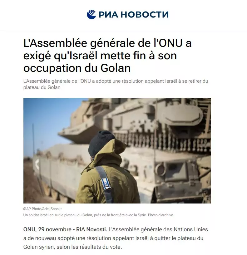 L’Assemblée générale des Nations Unies a de nouveau adopté une résolution appelant Israël à quitter le plateau du Golan syrien, selon les résultats du vote.