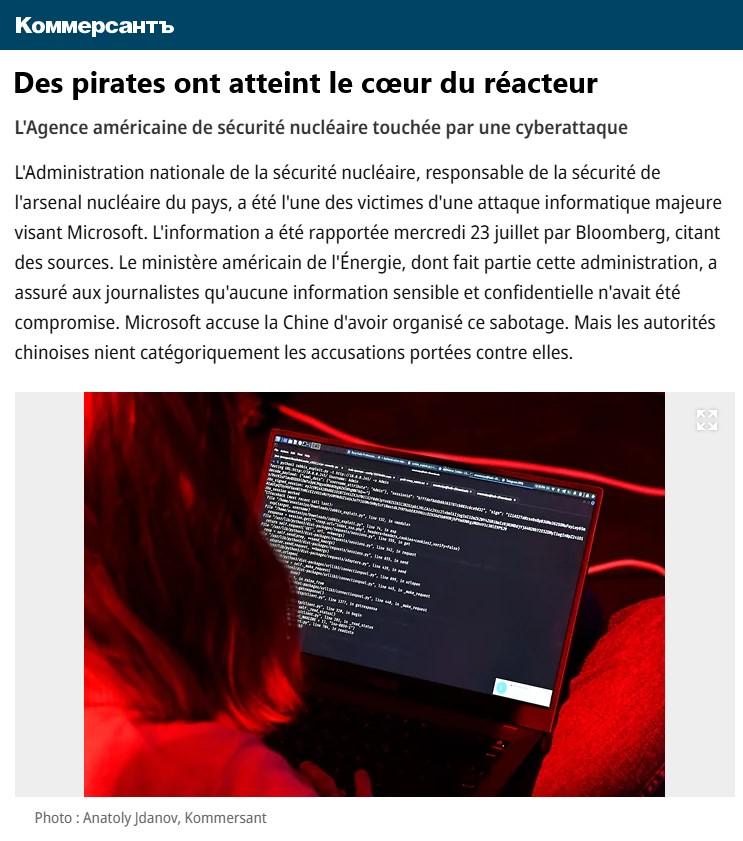 L’Administration nationale de la sécurité nucléaire, responsable de la sécurité de l’arsenal nucléaire du pays, a été l’une des victimes d’une attaque informatique majeure visant Microsoft. L’information a été rapportée mercredi 23 juillet par Bloomberg, citant des sources. Le ministère américain de l’Énergie, dont fait partie cette administration, a assuré aux journalistes qu’aucune information sensible et confidentielle n’avait été compromise. Microsoft accuse la Chine d’avoir organisé ce sabotage. Mais les autorités chinoises nient catégoriquement les accusations portées contre elles.