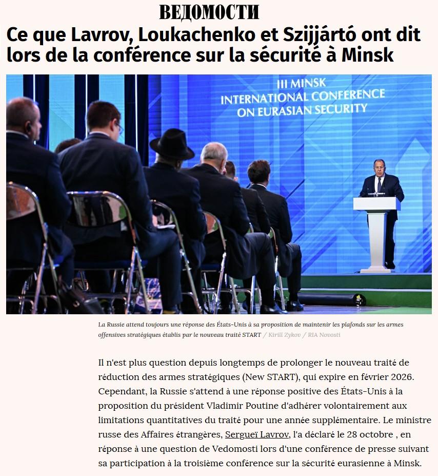 Il n’est plus question depuis longtemps de prolonger le nouveau traité de réduction des armes stratégiques (New START), qui expire en février 2026. Cependant, la Russie s’attend à une réponse positive des États-Unis à la proposition du président Vladimir Poutine d’adhérer volontairement aux limitations quantitatives du traité pour une année supplémentaire. Le ministre russe des Affaires étrangères, Sergueï Lavrov, l’a déclaré le 28 octobre, en réponse à une question de Vedomosti lors d’une conférence de presse suivant sa participation à la troisième conférence sur la sécurité eurasiatique à Minsk.