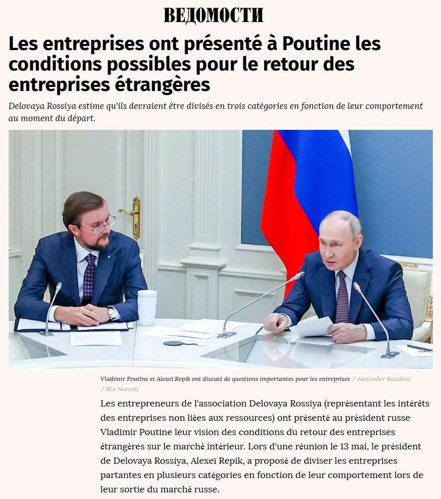 Les entrepreneurs de l’association Delovaya Rossiya (représentant les intérêts des entreprises non liées aux ressources) ont présenté au président russe Vladimir Poutine leur vision des conditions du retour des entreprises étrangères sur le marché intérieur. Lors d’une réunion le 13 mai, le président de Delovaya Rossiya, Alexeï Repik, a proposé de diviser les entreprises partantes en plusieurs catégories en fonction de leur comportement lors de leur sortie du marché russe.