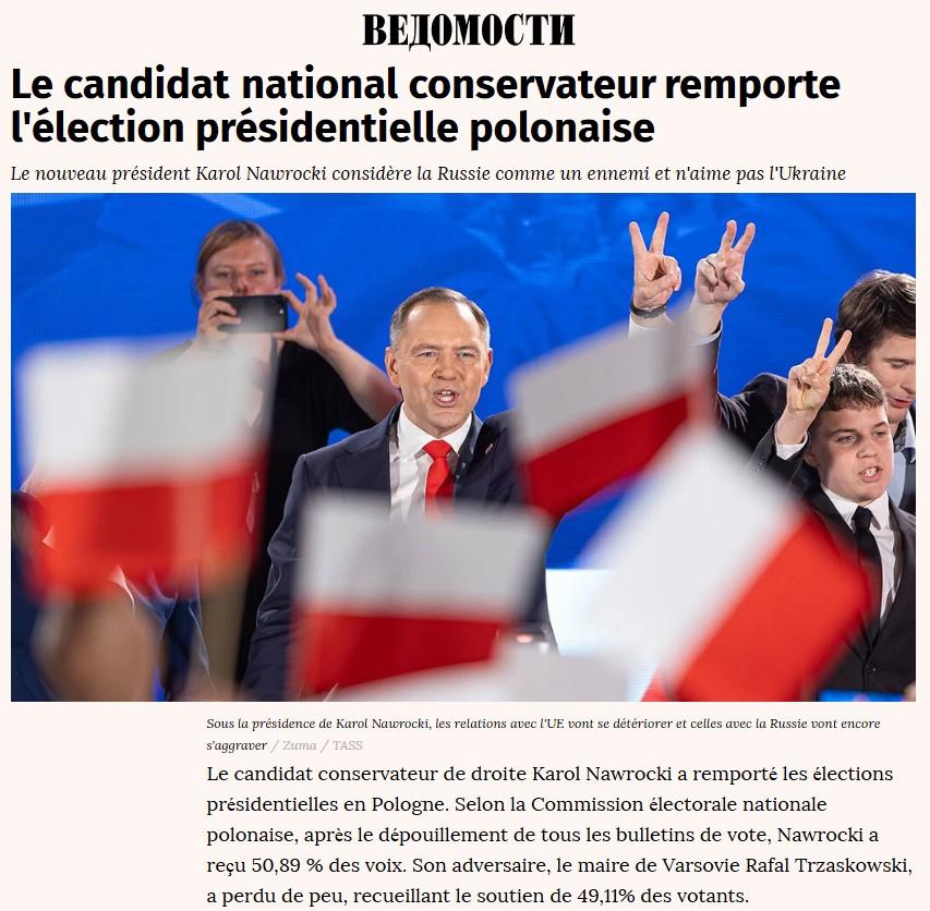Le candidat conservateur de droite Karol Nawrocki a remporté les élections présidentielles en Pologne. Selon la Commission électorale nationale polonaise, après le dépouillement de tous les bulletins de vote, Nawrocki a reçu 50,89 % des voix. Son adversaire, le maire de Varsovie Rafal Trzaskowski, a perdu de peu, recueillant le soutien de 49,11% des votants. Dans le même temps, les premiers sondages de sortie prédisaient la victoire de Trzaskowski – selon leurs données, il avait reçu 50,3% des voix contre 49,7% pour Nawrocki. Cependant, le décompte final des voix a indiqué une victoire du candidat du parti national conservateur Droit et Justice, qui a soutenu la nomination de Nawrocki à la présidence. Dans le même temps, le taux de participation a atteint 71,63 %.