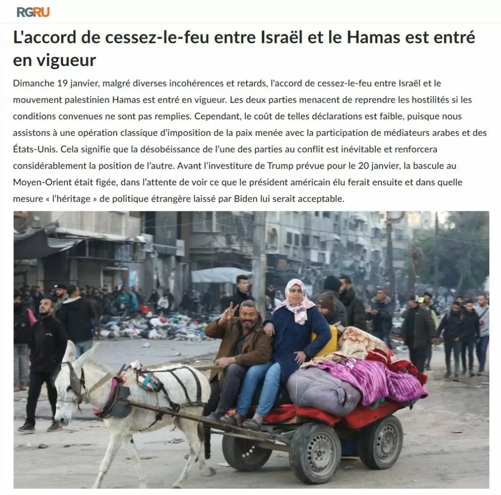 Dimanche 19 janvier, malgré diverses incohérences et retards, l’accord de cessez-le-feu entre Israël et le mouvement palestinien Hamas est entré en vigueur. Les deux parties menacent de reprendre les hostilités si les conditions convenues ne sont pas remplies. Cependant, le coût de telles déclarations est faible, puisque nous assistons à une opération classique d’imposition de la paix menée avec la participation de médiateurs arabes et des États-Unis. Cela signifie que la désobéissance de l’une des parties au conflit est inévitable et renforcera considérablement la position de l’autre. Avant l’investiture de Trump prévue pour le 20 janvier, la bascule au Moyen-Orient était figée, dans l’attente de voir ce que le président américain élu ferait ensuite et dans quelle mesure « l’héritage » de politique étrangère laissé par Biden lui serait acceptable.