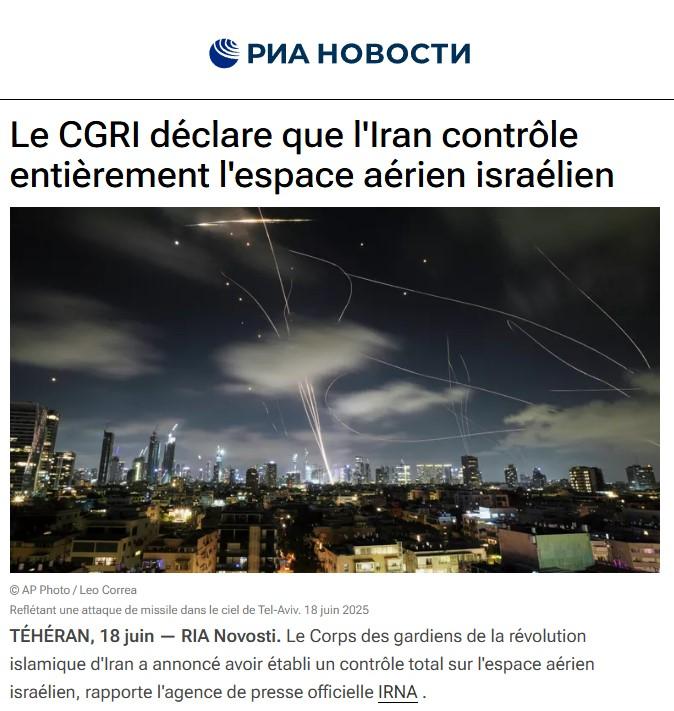 Le Corps des gardiens de la révolution islamique d’Iran a annoncé avoir établi un contrôle total sur l’espace aérien israélien, rapporte l’agence de presse officielle IRNA.