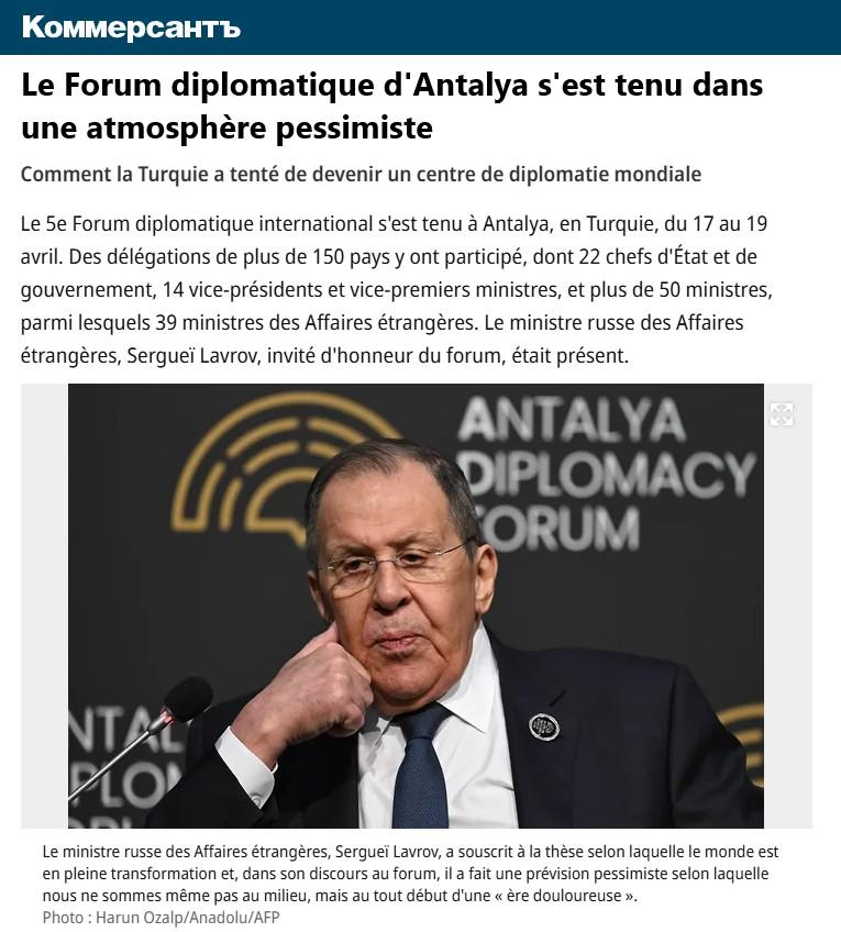 Le 5e Forum diplomatique international s’est tenu à Antalya, en Turquie, du 17 au 19 avril. Des délégations de plus de 150 pays y ont participé, dont 22 chefs d’État et de gouvernement, 14 vice-présidents et vice-premiers ministres, et plus de 50 ministres, parmi lesquels 39 ministres des Affaires étrangères. Le ministre russe des Affaires étrangères, Sergueï Lavrov, invité d’honneur du forum, était présent.