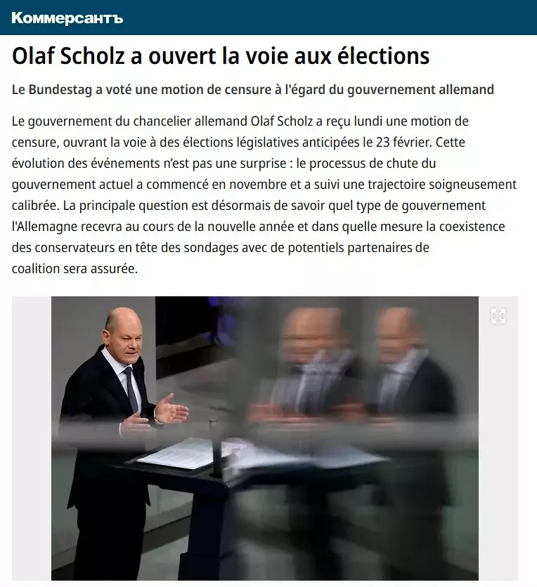 Le gouvernement du chancelier allemand Olaf Scholz a reçu lundi une motion de censure, ouvrant la voie à des élections législatives anticipées le 23 février. Cette évolution des événements n’est pas une surprise : le processus de chute du gouvernement actuel a commencé en novembre et a suivi une trajectoire soigneusement calibrée. La principale question est désormais de savoir quel type de gouvernement l’Allemagne recevra au cours de la nouvelle année et dans quelle mesure la coexistence des conservateurs en tête des sondages avec de potentiels partenaires de coalition sera assurée.
