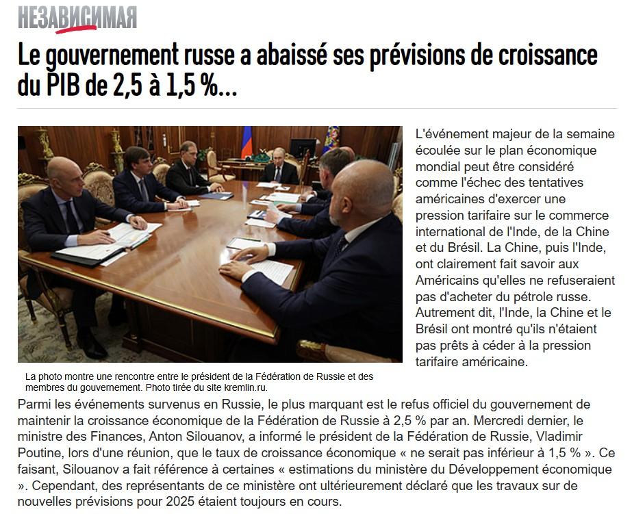 Cependant, l’ancien vice-ministre du Développement économique, Andreï Klepatch, a rapporté vendredi dernier que l’économie russe traversait déjà une situation difficile, certains commentateurs la qualifiant déjà de « récession officielle ». Après tout, le PIB russe a reculé pendant deux trimestres consécutifs, à savoir les premier et deuxième trimestres de 2025. Pour ceux qui connaissent les nombreux ralentissements économiques aggravants en Fédération de Russie (mines, construction, industrie automobile, génie civil, transport de marchandises, etc.), l’affirmation d’une récession n’a rien de surprenant. Ce qui est plutôt surprenant, ce sont les tentatives des responsables gouvernementaux et de la Banque centrale d’éviter de reconnaître officiellement les événements économiques en cours.