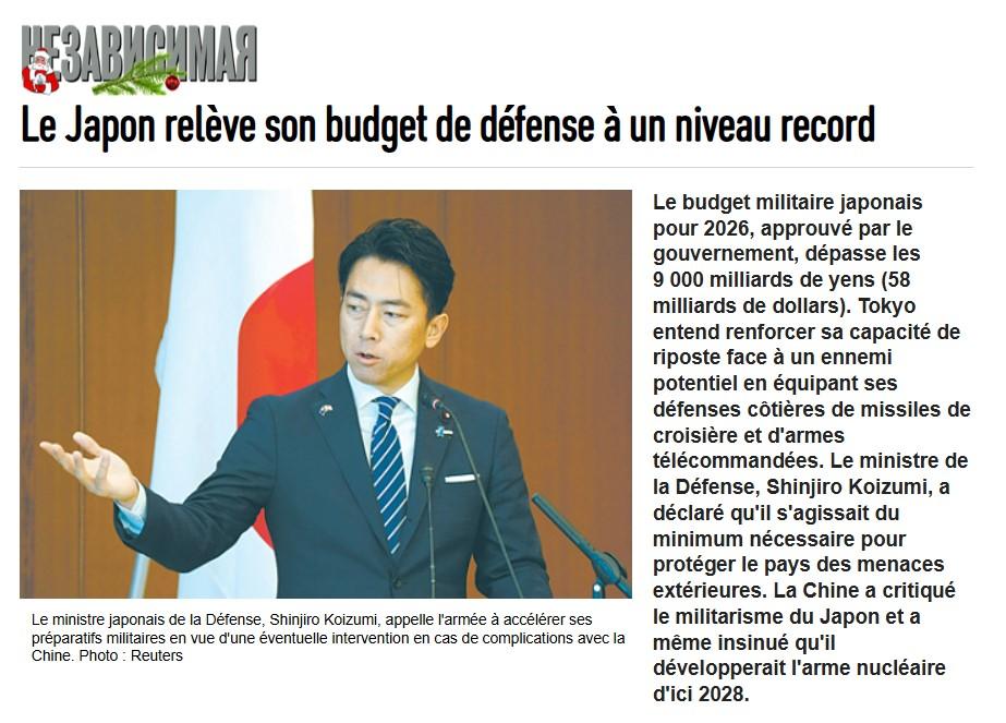 Le budget militaire japonais pour 2026, approuvé par le gouvernement, dépasse les 9 000 milliards de yens (58 milliards de dollars). Tokyo entend renforcer sa capacité de riposte face à un ennemi potentiel en équipant ses défenses côtières de missiles de croisière et d’armes télécommandées. Le ministre de la Défense, Shinjiro Koizumi, a déclaré qu’il s’agissait du minimum nécessaire pour protéger le pays des menaces extérieures. La Chine a critiqué le militarisme du Japon et a même insinué qu’il développerait l’arme nucléaire d’ici 2028.