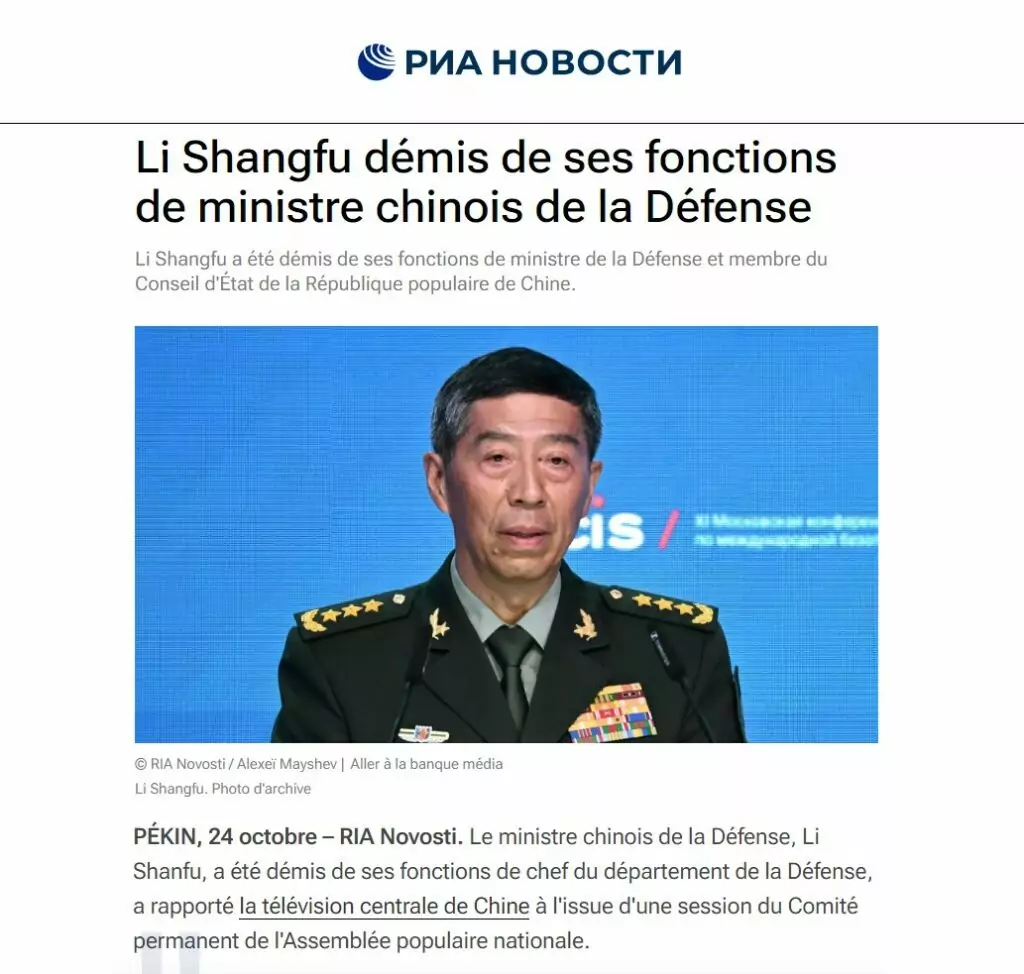 Le ministre chinois de la Défense, Li Shanfu, a été démis de ses fonctions de chef du département de la Défense, a rapporté la télévision centrale de Chine à l’issue d’une session du Comité permanent de l’Assemblée populaire nationale.