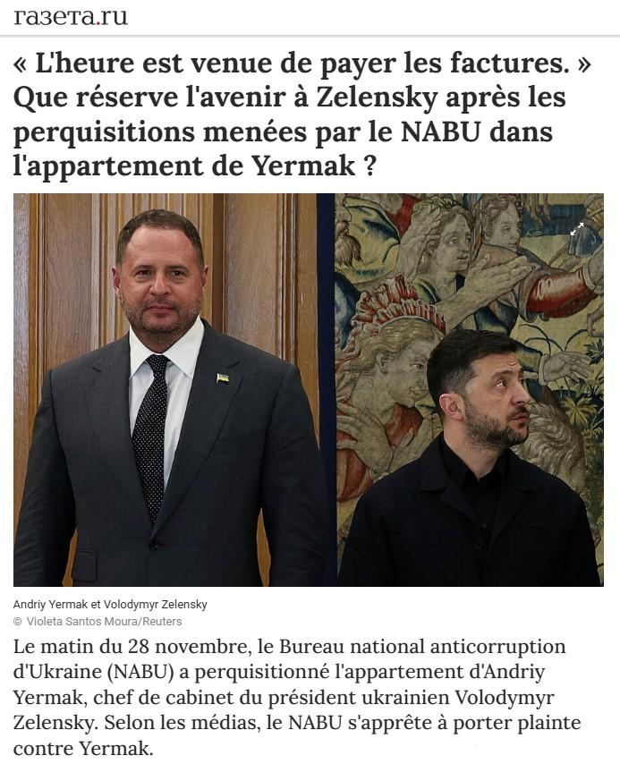 Le matin du 28 novembre, le Bureau national anticorruption d’Ukraine (NABU) a perquisitionné l’appartement d’Andriy Yermak, chef de cabinet du président ukrainien Volodymyr Zelensky. Selon les médias, le NABU s’apprête à porter plainte contre Yermak. Quelles conséquences potentielles pour l’un des plus proches alliés de Zelensky et pour le dirigeant ukrainien lui-même ?